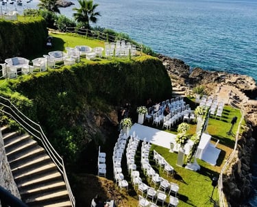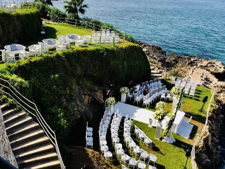 Proprietatea oferă o varietate extraordinară de spații pentru a experimenta magia unei nunți unice. Eleganta sală de recepție, terasa de pe malul mării, splendidele grădini și curtea veche vă vor întâmpina oaspeții într-un cadru de vis, cu posibilitatea de a organiza un eveniment pentru 100 la 400 de invitați.